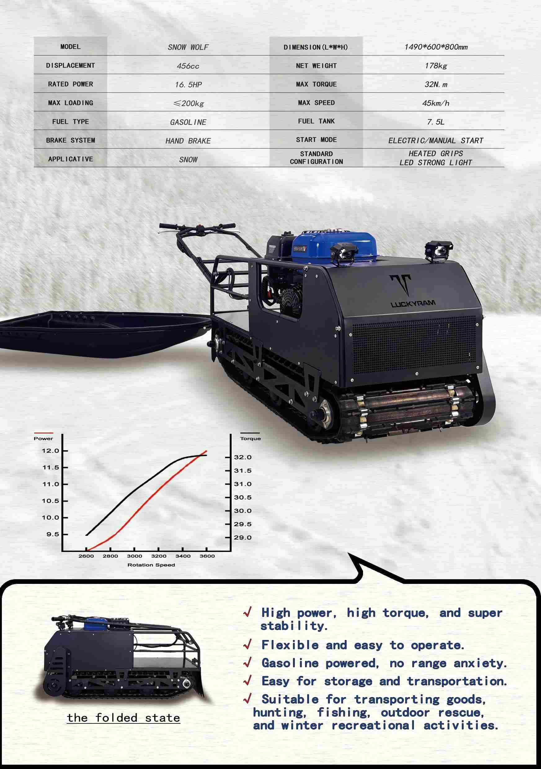 Dikuasakan oleh enjin 456cc berkualiti tinggi dan dilengkapi dengan luncur besar, kenderaan ini sesuai untuk salji yang mendalam. Enjinnya yang kuat memastikan pemanduan yang menyeronokkan di salji.